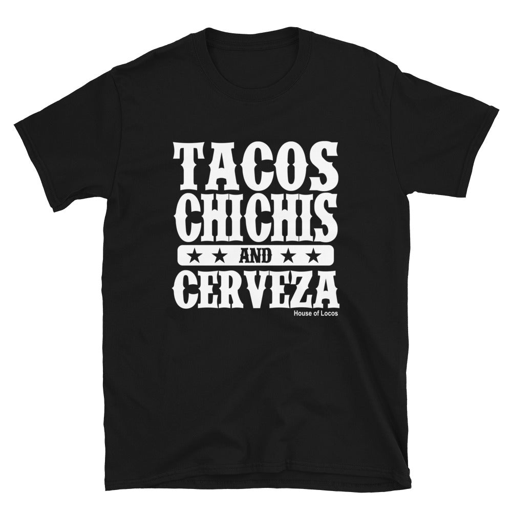 Tacos Chichis And Cerveza T-Shirts are printed in USA