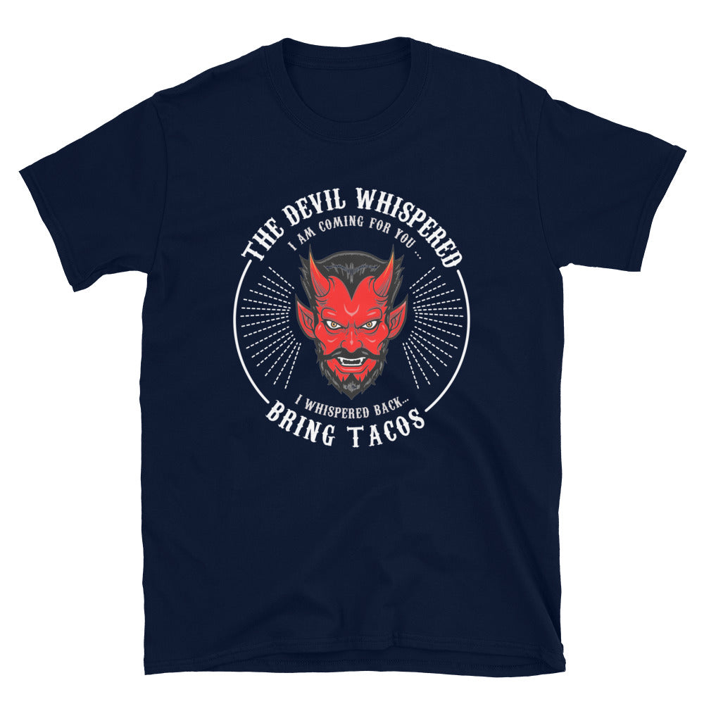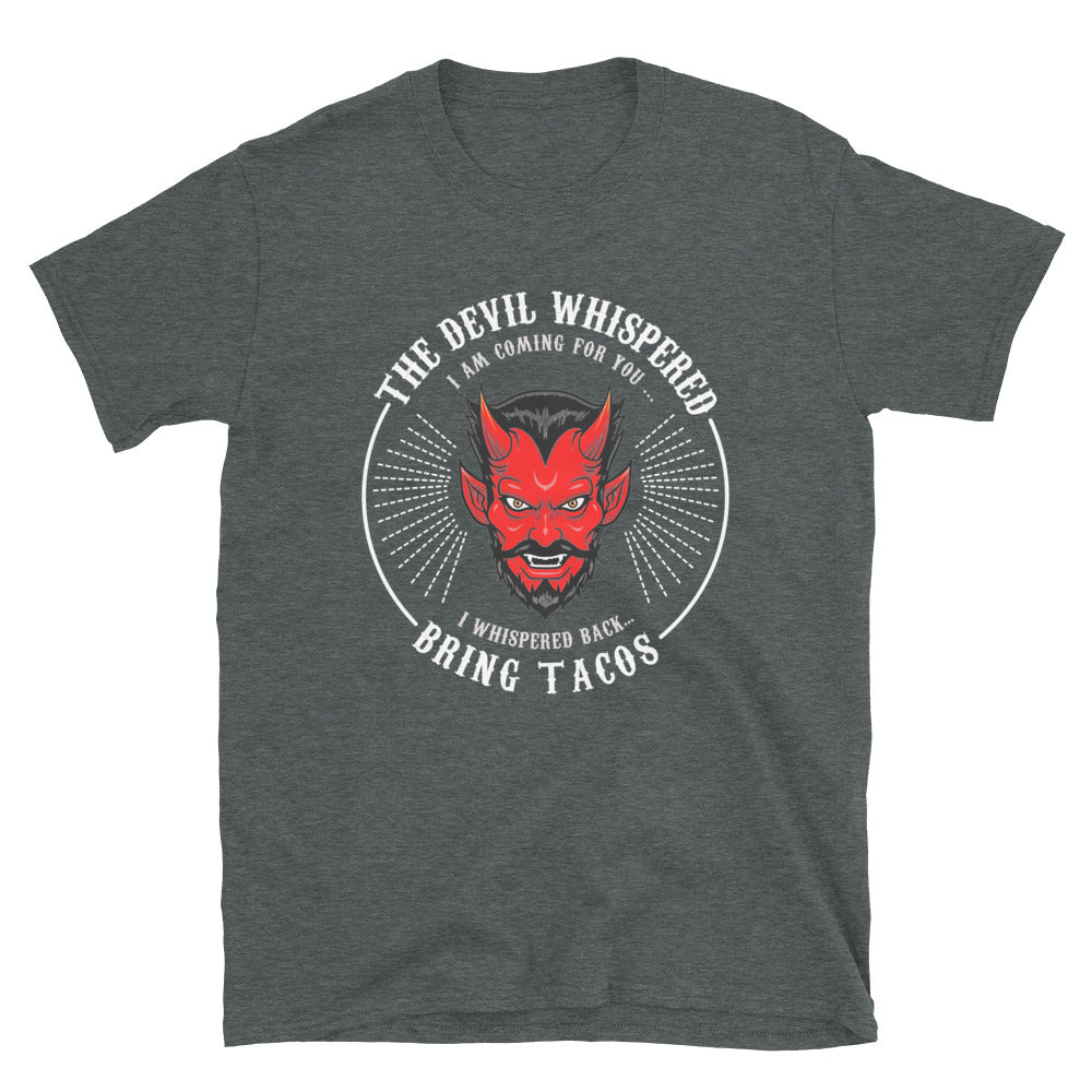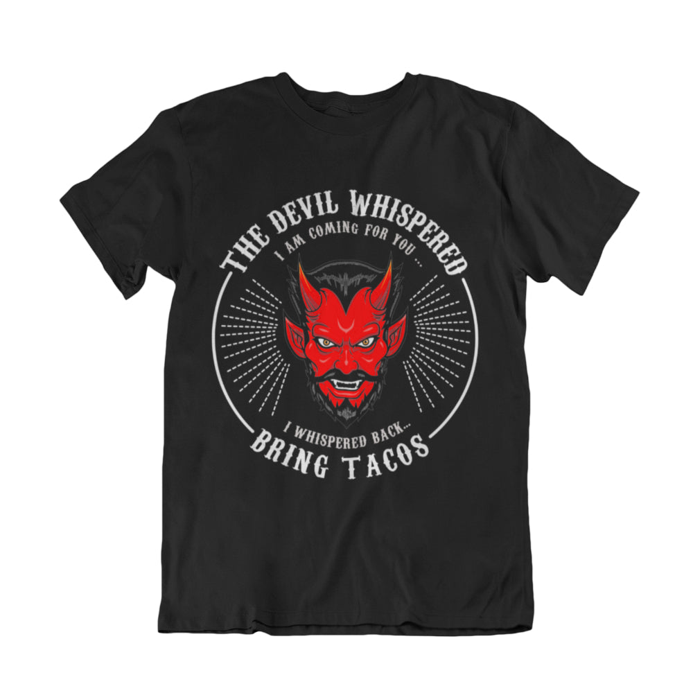 This tee features message "The Devil Whispered I'M Coming for You... I Whispered Back... Bring Tacos"